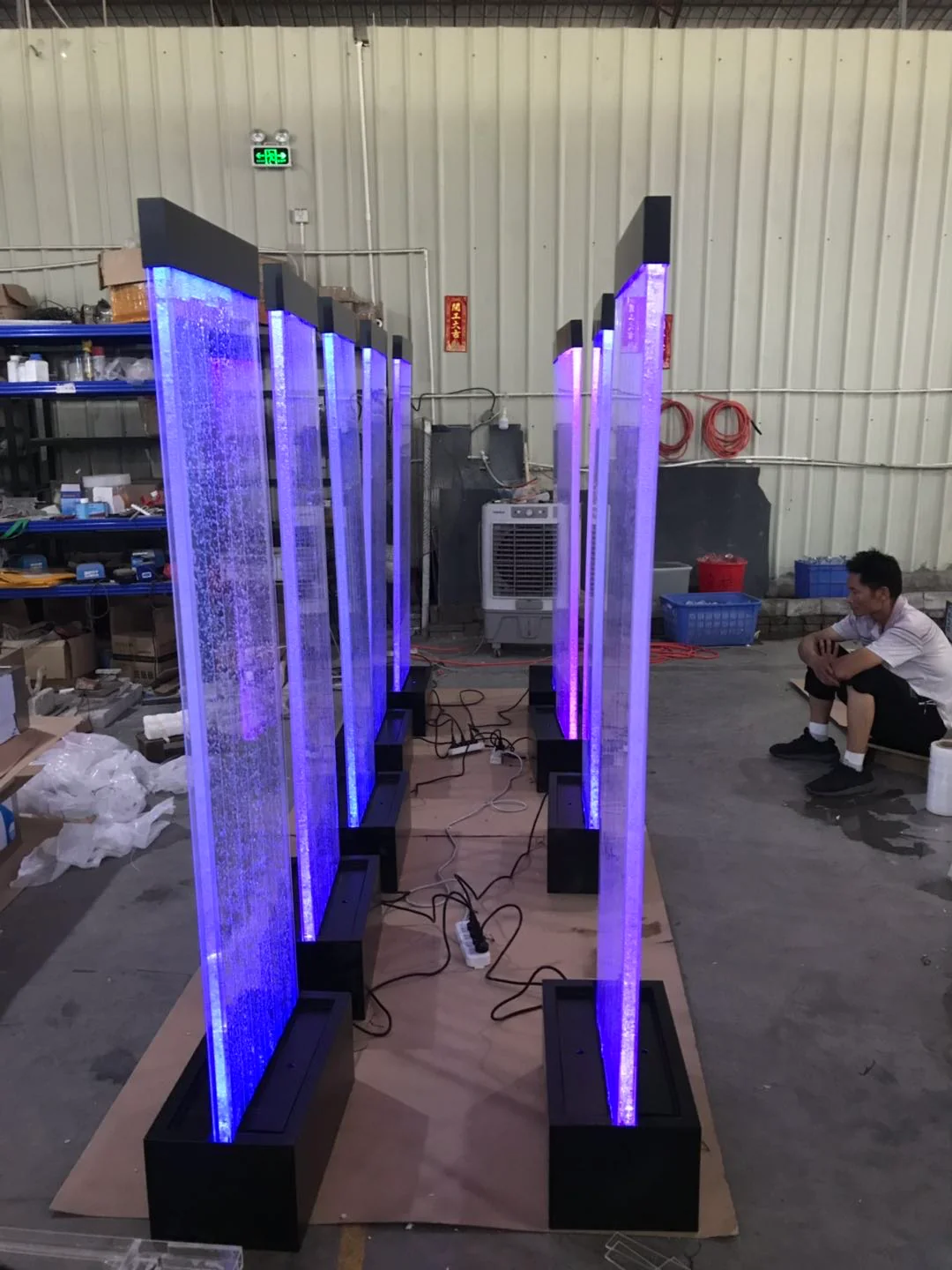 Tall Floor Standing Bubble Wall with Acrylic Clear Panel & Upright Division Bar, viewable from both sides & can be placed in corner or centre of the room. Comes in Painted Stainless Steel Frame with Remote Control for Lights Settings. Delivered with black medium stones for the base.