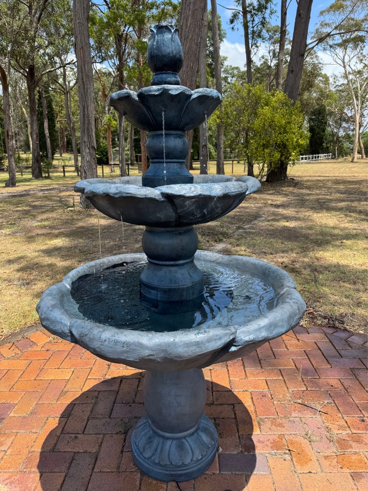 The water circulates from a reservoir hidden inside the feature and is pumped out of the pineapple on the top of the fountain, before gently spilling down through the final tier, ready to be pumped back up to start the cycle all over again.